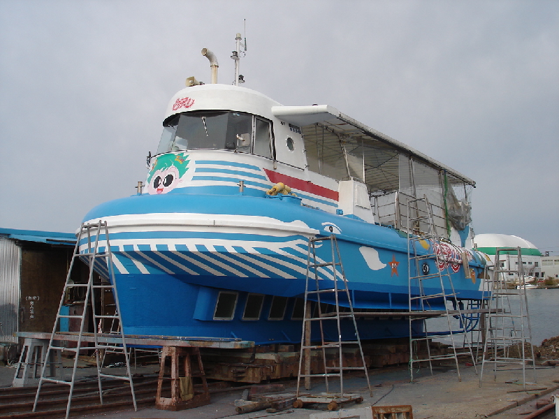 奥能登の景勝地九十九湾を一望できる遊覧船、ピュアリとティアラを上架中です。観光時期に向けてお色直しです。